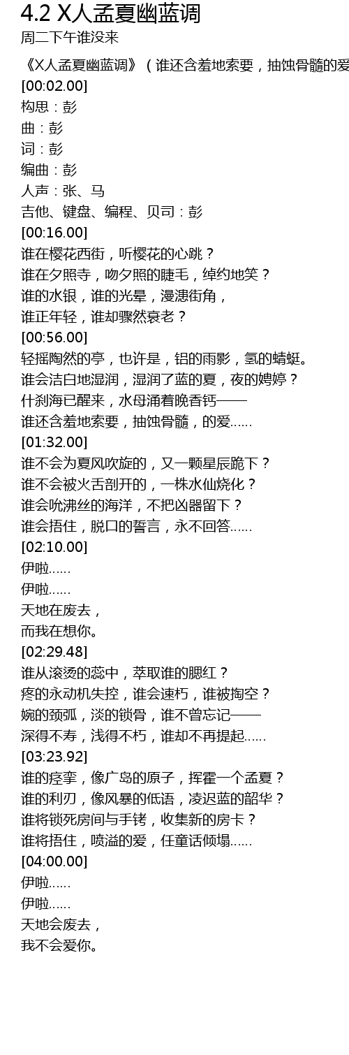 | [00:01.00] | 《X人孟夏幽蓝调》(谁还含羞地索要,抽蚀骨髓的爱) |
