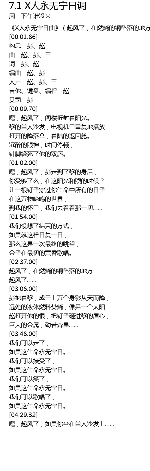 | [00:01.00] | 《X人永无宁日曲》(起风了,在燃烧的钢坠落的地方) |