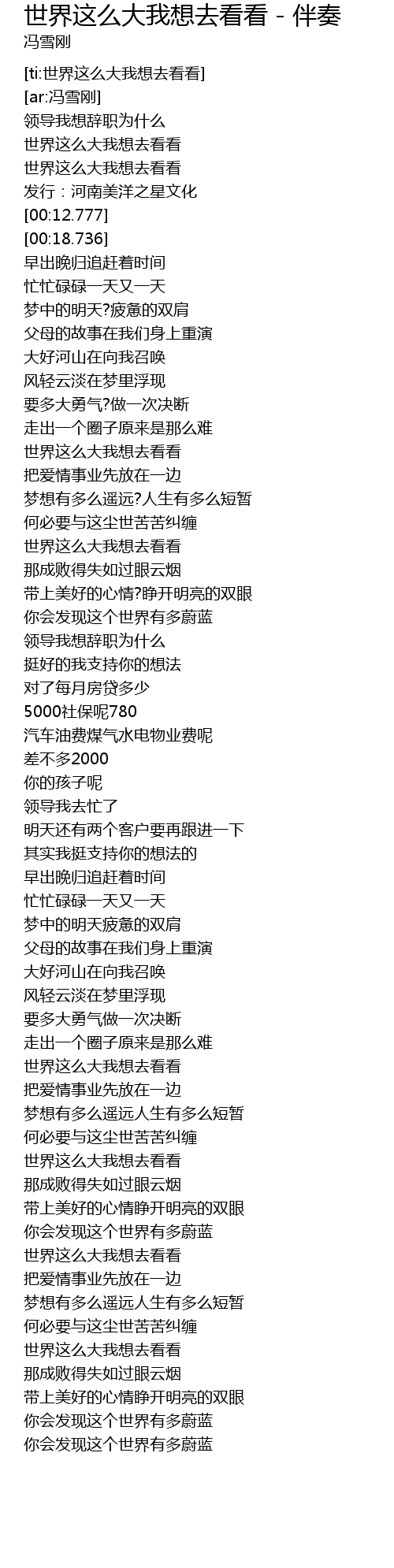 | [00:03.127] | shì jiè zhè me dà wǒ xiǎng qù kàn kàn |