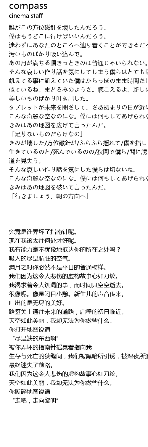 | [03:03.13] | きみが壊した/方位磁針が/ふらふら揺れて/僕を指した/ |
