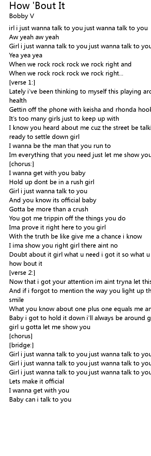 Doubt about it girl what u need i got it so what u say how bout it how bout it how bout it |