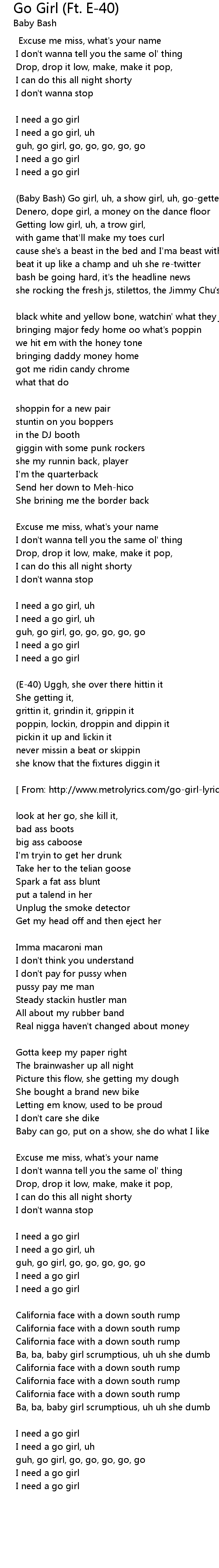| [ From: http://www.metrolyrics.com/go-girl-lyrics-baby-bash.html ] | |