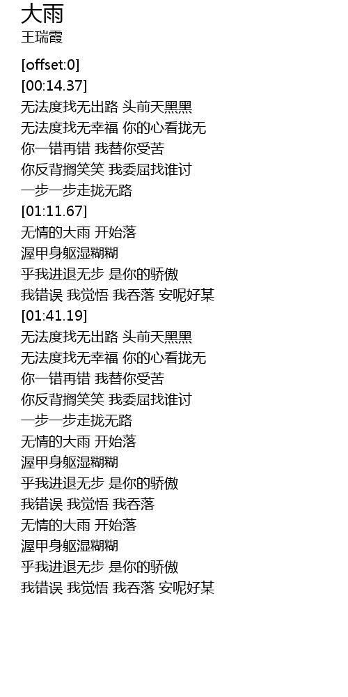 | [01:12.30] | wú qíng de dà yǔ kāi shǐ luò |