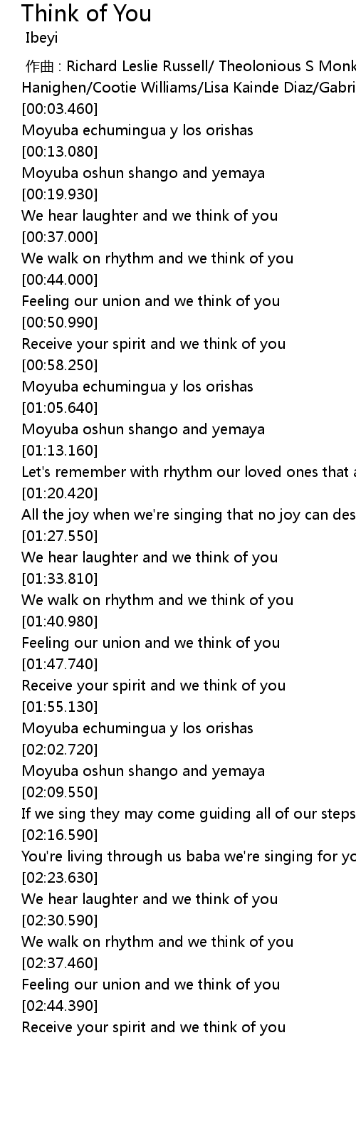 | [00:00.00] | zuo qu : Richard Leslie Russell Theolonious S Monk Bernard D Hanighen Cootie Williams Lisa Kainde Diaz Gabriel Jourde Maya Dagnino Naomi Diaz |