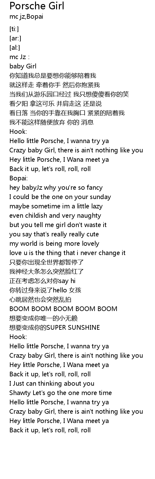 | [01:49.43] | Hey little Porsche, I Wana meet ya |