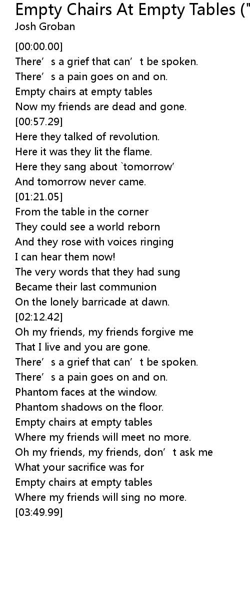 | [03:30.72] | Empty chairs at empty tables |