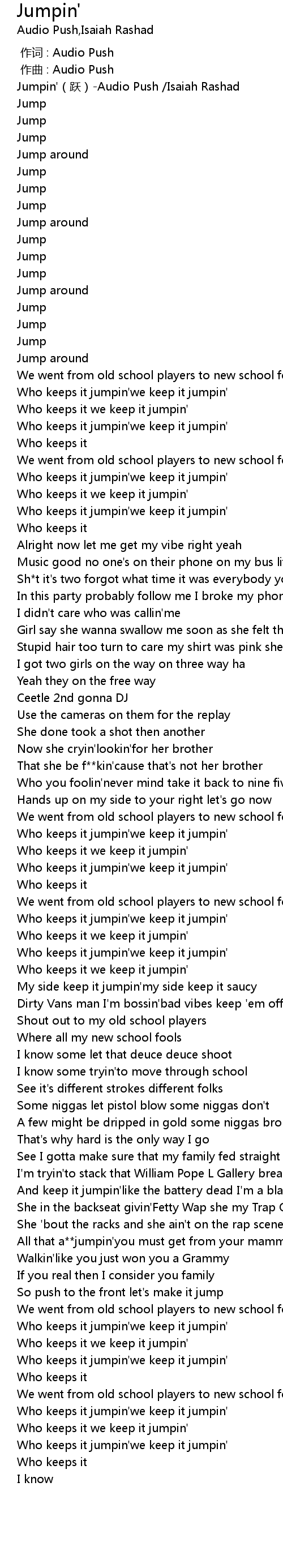 | [00:00.00] | Jumpin'(跃)-Audio Push /Isaiah Rashad |
