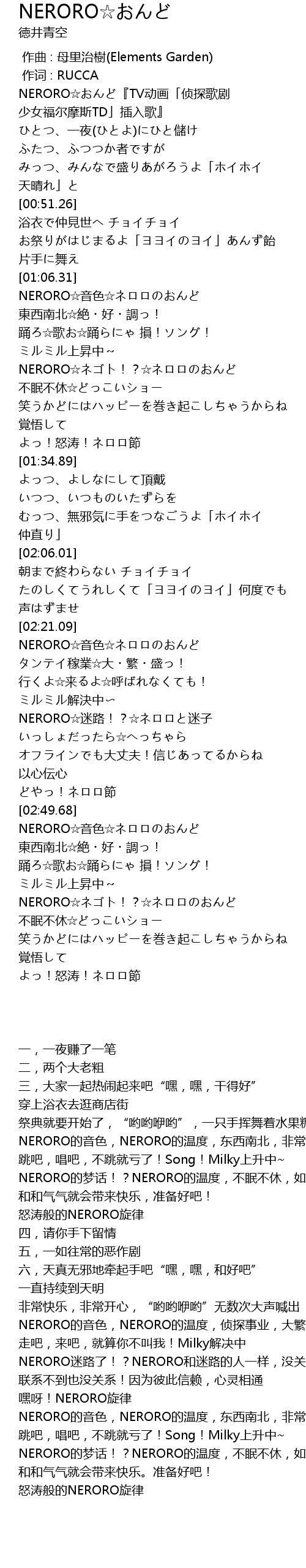 | [00:01.36] | NERORO☆おんど『TV动画「侦探歌剧 少女福尔摩斯TD」插入歌』 |
