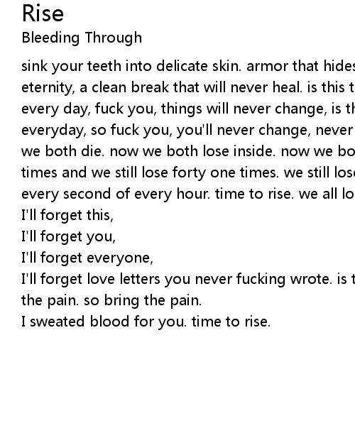 sink your teeth into delicate skin. armor that hides your thoughts for this eternity, a clean break that will never heal. is this the pain that was felt every day, fuck you, things will never change, is this the pain that was felt everyday, so fuck you, you'll never change, never change. now we both bleed, now we both die. now we both lose inside. now we both bleed, we've been here forty times and we still lose forty one times. we still lose in the end, time to rise. every second of every hour. time to rise. we all lose in the end. |