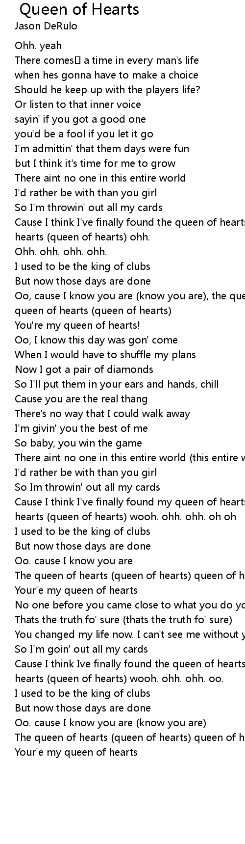 | Cause I think Ive finally found the queen of hearts (queen of hearts) queen of hearts (queen of hearts) wooh. ohh. ohh. oo. | |