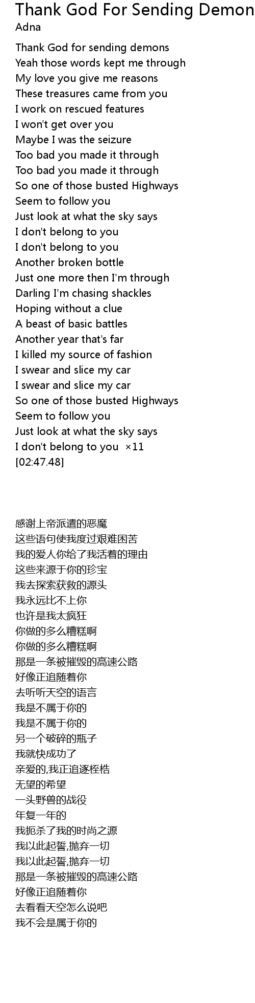 | Song | Thank God For Sending Demons (Kleerup cover) |