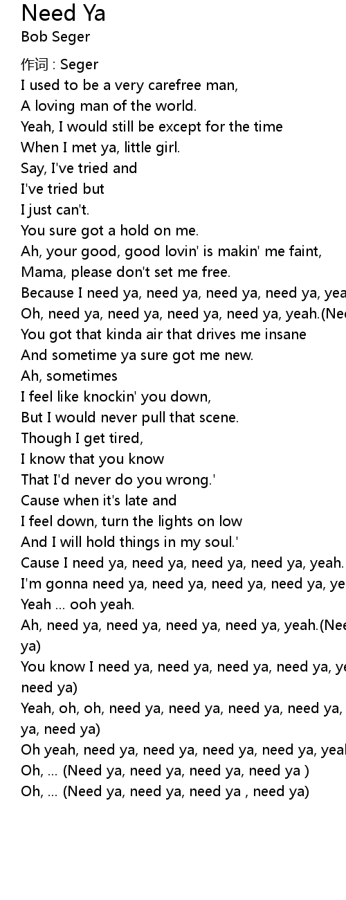 | Ah, need ya, need ya, need ya, need ya, yeah. Need ya, need ya, need ya, need ya | |