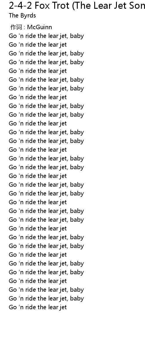 | [00:30.15] | Go ' n ride the lear jet |