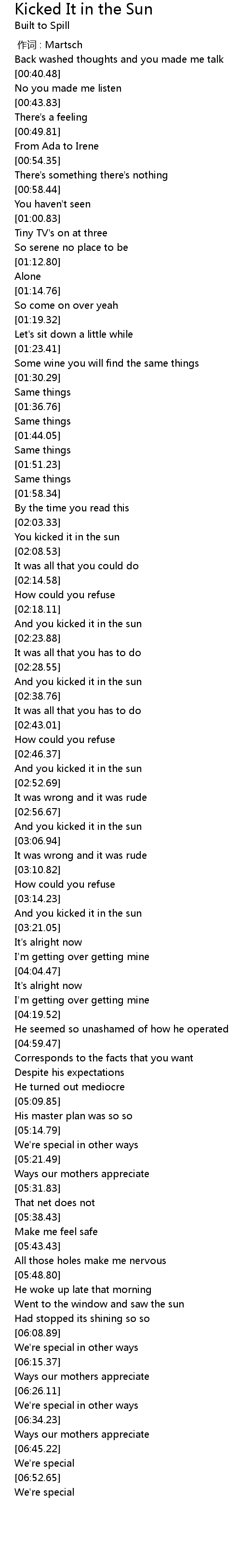 | [02:19.31] | And you kicked it in the sun |