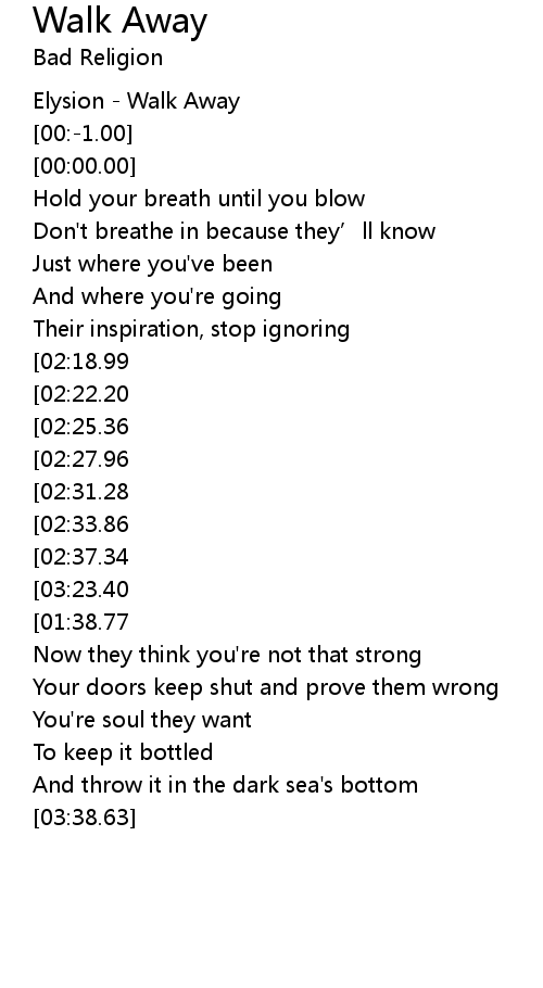| [03:26.38][03:23.40][03:20.24][02:41.04][01:35.72] | Just walk away |
