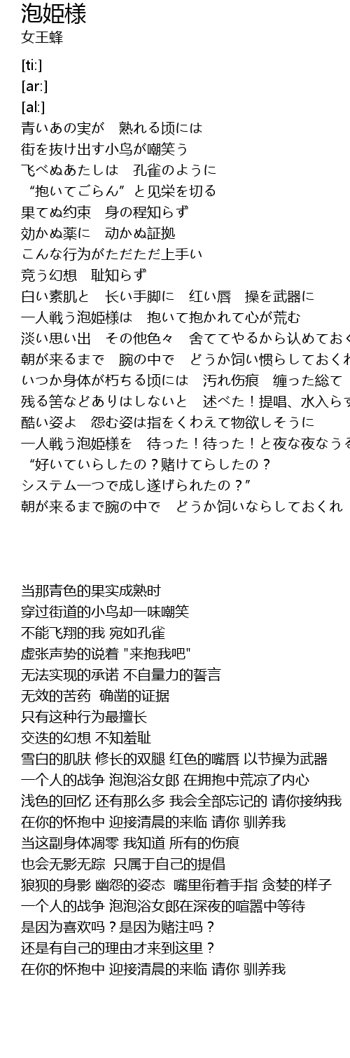 | [00:35.41] | 一人戦う泡姫様は 抱いて抱かれて心が荒む |