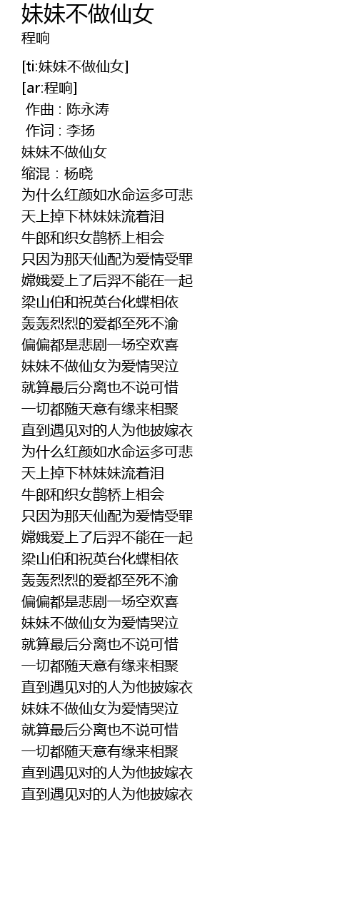| [01:06.681] | 妹妹不做仙女为爱情哭泣 |