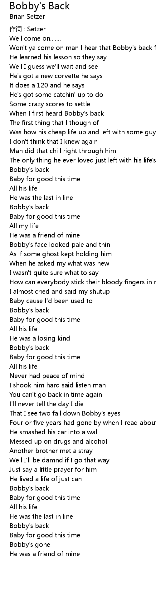 | When I first heard Bobby' s back | |