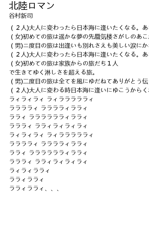 | (2人)大人に変わる時日本海に逢いにゆこうからくれないに染まる夕陽のあの場所へ大人に変わる時日本海に抱かれにゆこうやさしさのゆりかごに抱かれに帰ろう。 | |