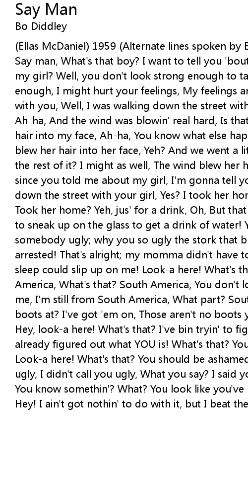 (Ellas McDaniel) 1959 (Alternate lines spoken by BO DIDDLEY and Jerome Green): Say man, What's that boy? I want to tell you 'bout your girlfriend, What about my girl? Well, you don't look strong enough to take the message, I'm strong enough, I might hurt your feelings, My feelings are already hurt by being here with you, Well, I was walking down the street with your girl the other day, Ah-ha, And the wind was blowin' real hard, Is that right? And the wind blew her hair into my face, Ah-ha, You know what else happened? What happened? The wind blew her hair into her face, Yeh? And we went a little further; you wanna hear the rest of it? I might as well, The wind blew her hair into the street! Hey; since you told me about my girl, I'm gonna tell you about yours. I was walking down the street with your girl, Yes? I took her home, for a drink, you know, Took her home? Yeh, jus' for a drink, Oh, But that chick looked so ugly, she had to sneak up on the glass to get a drink of water! You've got the nerve to call somebody ugly; why you so ugly the stork that brought you in the world oughta be arrested! That's alright; my momma didn't have to put a sheet on my head so sleep could slip up on me! Look-a here! What's that? Where are you from? South America, What's that? South America, You don't look like no South American to me, I'm still from South America, What part? South Texas! Where are your workin' boots at? I've got 'em on, Those aren't no boots you got on; those broguettes! Hey, look-a here! What's that? I've bin tryin' to figure out what you is, I already figured out what YOU is! What's that? You that thing I throw peanuts at! Look-a here! What's that? You should be ashamed of yourself, Why? Calling people ugly, I didn't call you ugly, What you say? I said you was ruined, that's all! You know somethin'? What? You look like you've bin whooped with a ugly-stick! Hey! I ain't got nothin' to do with it, but I beat the fellah right...! |