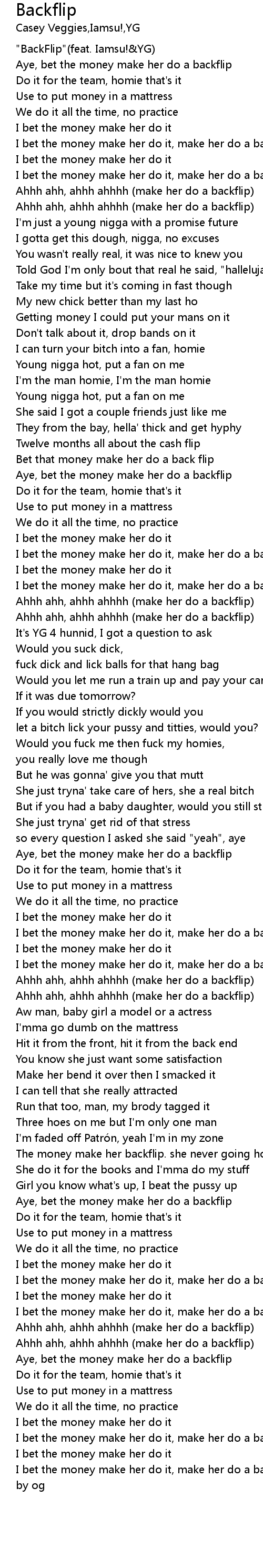 | [00:22.01] | I bet the money make her do it, make her do a backflip |