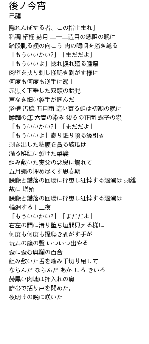 | [01:13.79] | 浴槽 汚穢 五月雨 這い寄る蛆は初潮の晩に |