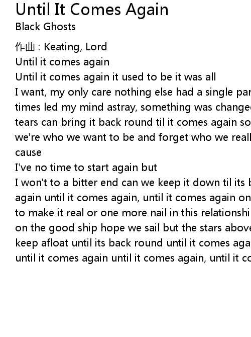 | I won' t to a bitter end can we keep it down til its back round til it comes again until it comes again, until it comes again one more time to take the test to make it real or one more nail in this relationship make it impossible to heal on the good ship hope we sail but the stars above say the wind will fail can we keep afloat until its back round until it comes again until it comes again, until it comes again until it comes again, until it comes again |