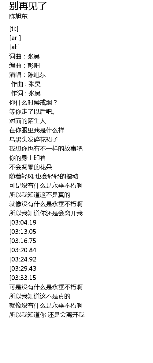 | [03:54.22][03:20.84][01:58.05] | 别再见了这位姑娘 |