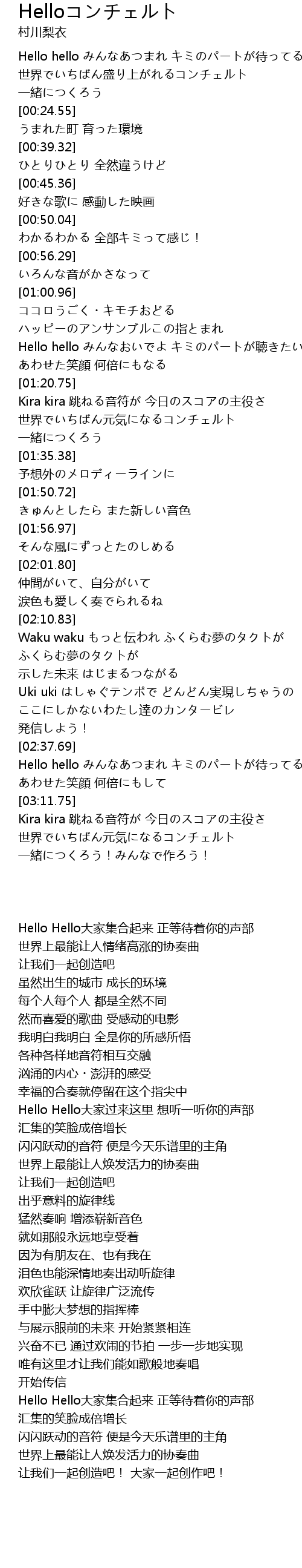 | [03:01.54] | Hello hello みんなあつまれ キミのパートが待ってる |