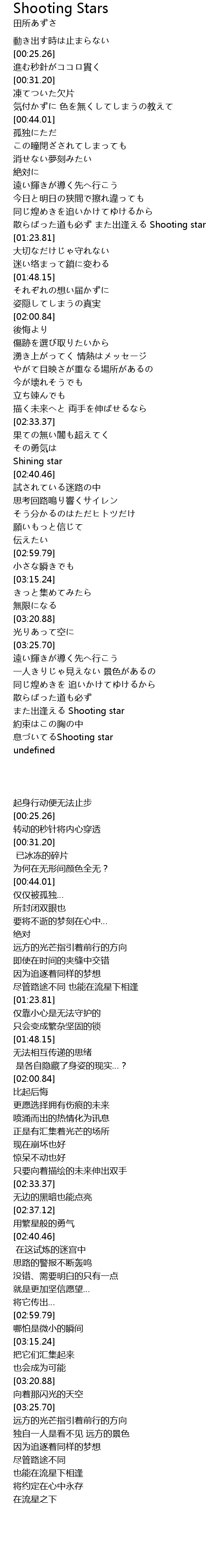 | [01:17.15] | 散らばった道も必ず また出逢える Shooting star |