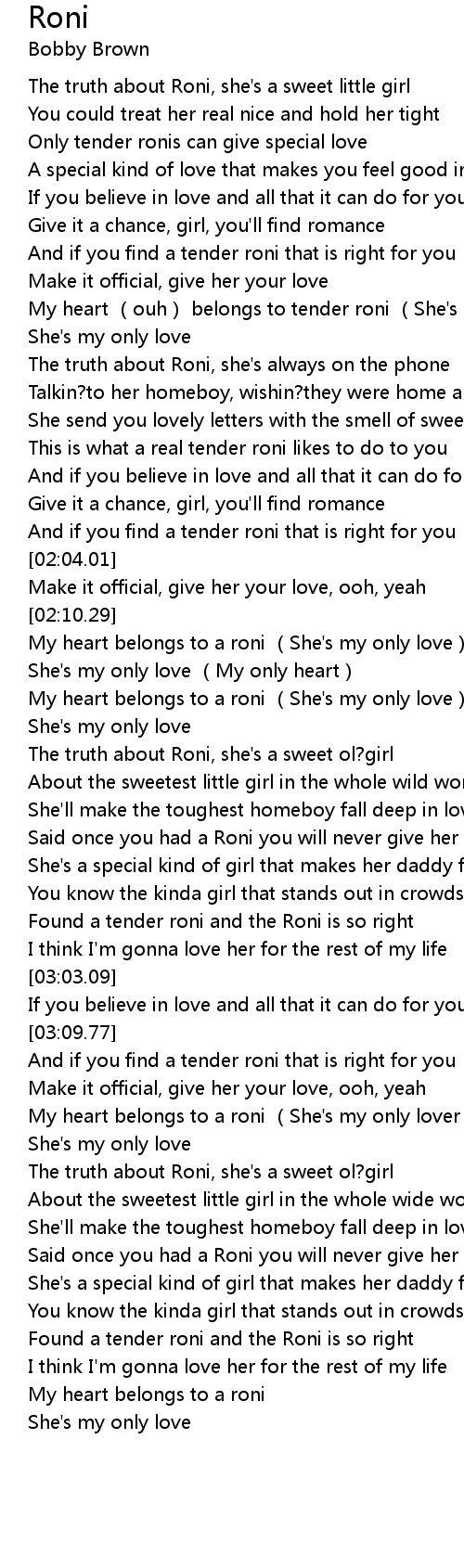 | [00:15.01] | The truth about Roni, she's a sweet little girl |