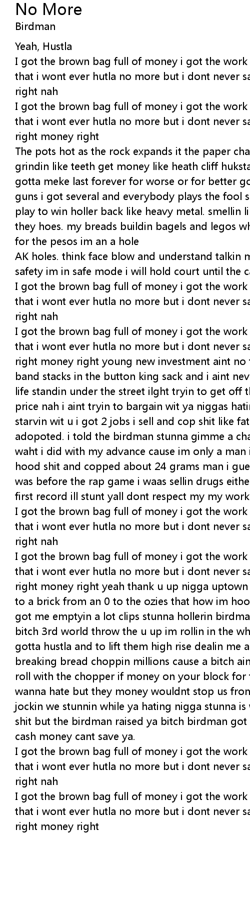 I got the brown bag full of money i got the work goin to florida and i swore that i wont ever hutla no more but i dont never say that no more got my mind right money right yeah thank u up nigga uptown from an 8 to a quater from a half to a brick from an 0 to the ozies that how im hood rich and murder was the case got me emptyin a lot clips stunna hollerin birdman nigga right back in this bitch 3rd world throw the u up im rollin in the whip with this money on my mind gotta hustla and to lift them high rise dealin me and youngin on some shit breaking bread choppin millions cause a bitch aint shit told as a youngin how roll with the chopper if money on your block for the money ima pop ya nigga wanna hate but they money wouldnt stop us from ridin fly whips now they hoe out jockin we stunnin while ya hating nigga stunna is wat made ya i hear ya poppin shit but the birdman raised ya bitch birdman got an army birdman got a navy and cash money cant save ya. |