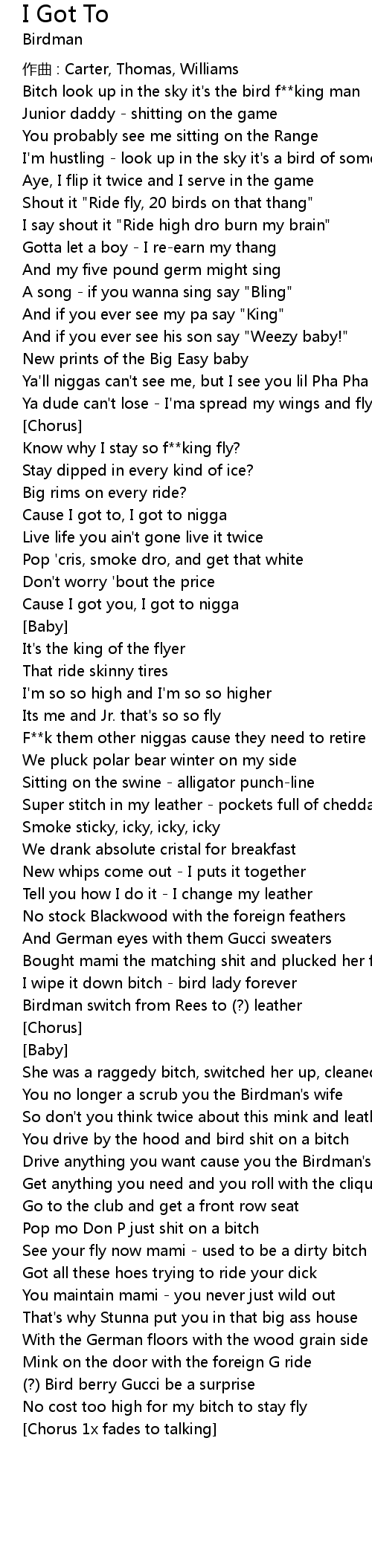 | Shout it " Ride fly, 20 birds on that thang" | |