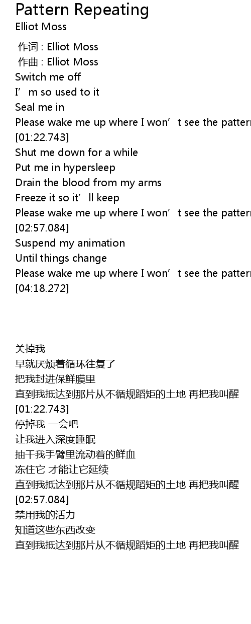 | [00:44.113] | Please wake me up where I won’t see the patterns |