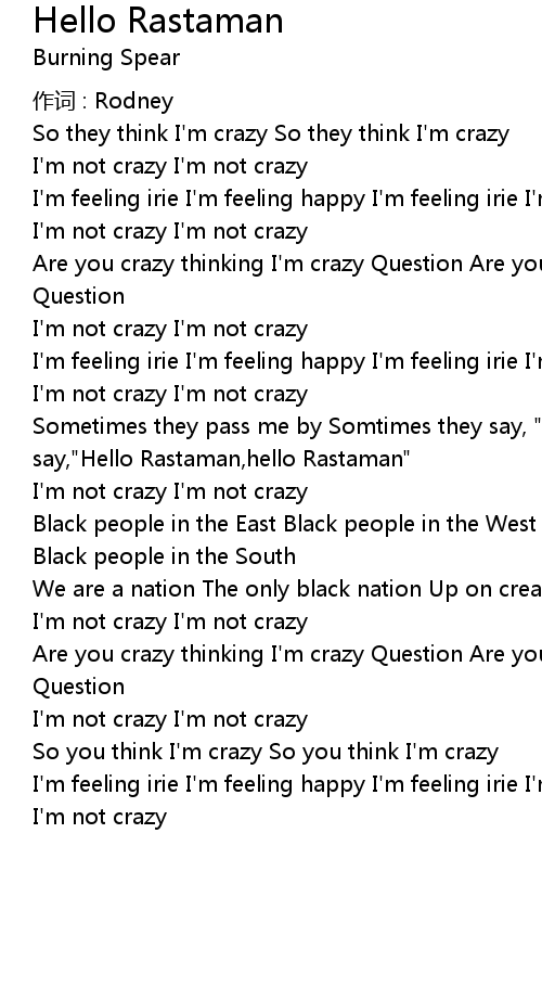 | Sometimes they pass me by Somtimes they say, " Hi" Exclamation Sometimes they say," Hello Rastaman, hello Rastaman" | |