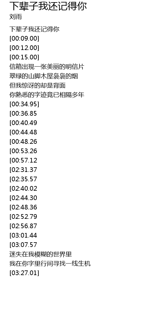 | [03:29.23][02:31.37][00:59.24] | nǐ shuō xià bèi zi rú guǒ wǒ hái jì de nǐ |