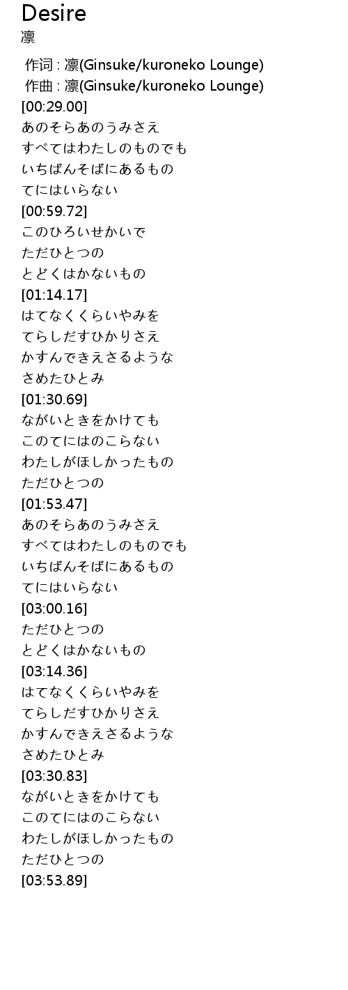 | [00:00.000] | 作词 : 凛(Ginsuke/kuroneko Lounge) |