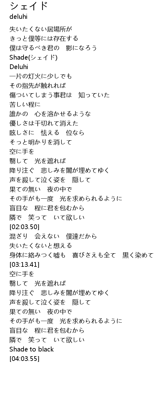 | [03:04.23] | 身体に絡みつく嘘も 喜びさえも全て 黒く染めて |