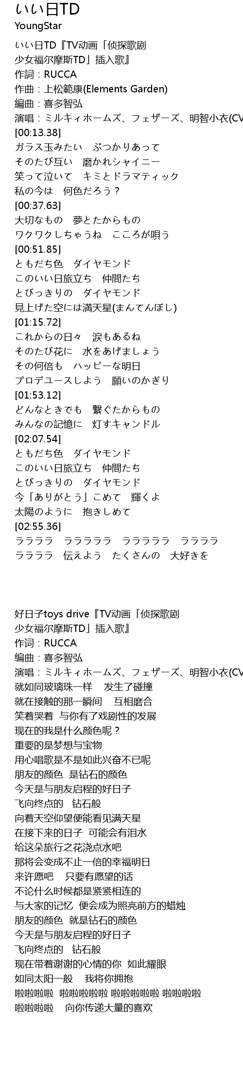 | [00:01.36] | いい日TD『TV动画「侦探歌剧 少女福尔摩斯TD」插入歌』 |