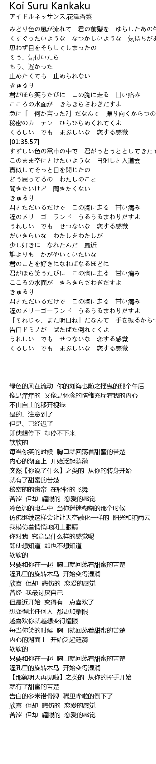 | [01:29.84] | くるしい でも まぶしいな 恋する感覚 |