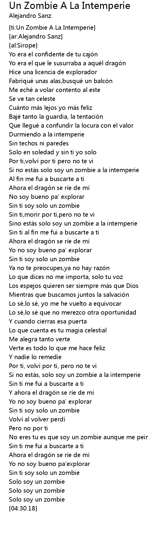 | [01:39.33] | Si no está s solo soy un zombie a la intemperie |