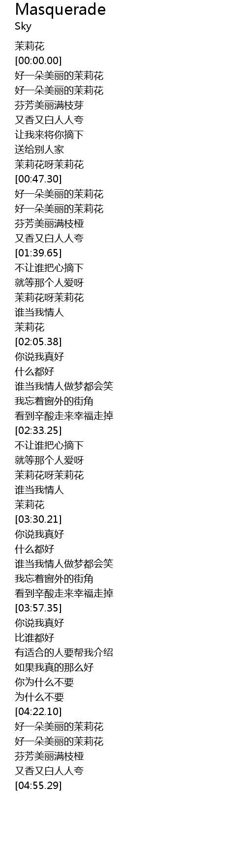 | [04:28.52] | 好一朵美丽的茉莉花 |