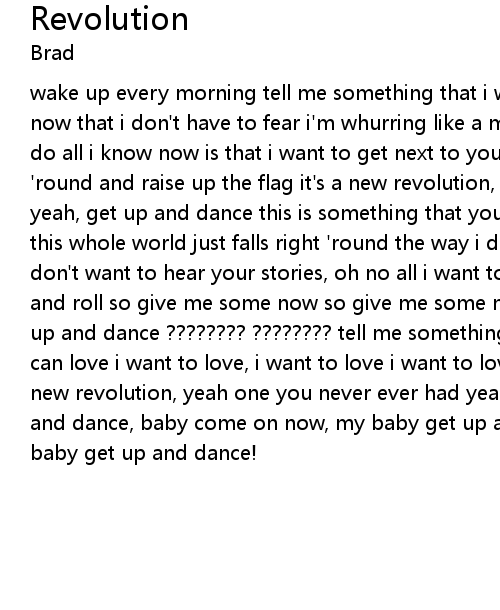 wake up every morning tell me something that i want to hear give me something now that i don't have to fear i'm whurring like a motor tell me what i want to do all i know now is that i want to get next to you, again everybody gather 'round and raise up the flag it's a new revolution, yeah one you never ever had yeah, get up and dance this is something that you know that is ? the same when this whole world just falls right 'round the way i don't want to hear you laugh, don't want to hear your stories, oh no all i want to hear now is a nasty rock and roll so give me some now so give me some na-na-now shake up and dance stand up and dance ???????? ???????? tell me something nice, tell me something nice i can love i want to love, i want to love i want to love, i want to love! it's a new revolution, yeah one you never ever had yeah, stand up and dance shake up and dance, baby come on now, my baby get up and dance, my baby come on now, my baby get up and dance! |