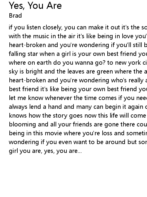 if you listen closely, you can make it out it's the sound of a choir sing along with the music in the air it's like being in love you're lost but not heart-broken and you're wondering if you'll still be around it's like catching a falling star when a girl is your own best friend you are, yeah, you are... so where on earth do you wanna go? to new york city or southern mecixo? where the sky is bright and the leaves are green where the air is clear and lost but not heart-broken and you're wondering who's really around it's like being your own best friend it's like being your own best friend you are, yeah, you are... so let me know whenever the time comes if you need any assistance cuz you know i'll always lend a hand and many can begin it again cuz i'll tell you who knows who knows how the story goes now this life will come to an end when the flowers are blooming and all your friends are gone there couldn't be a more fitting end being in this movie where you're loss and sometimes you're heart-broken you're wondering if you even want to be around but sometimes your own best friend is a girl you are, yes, you are... |