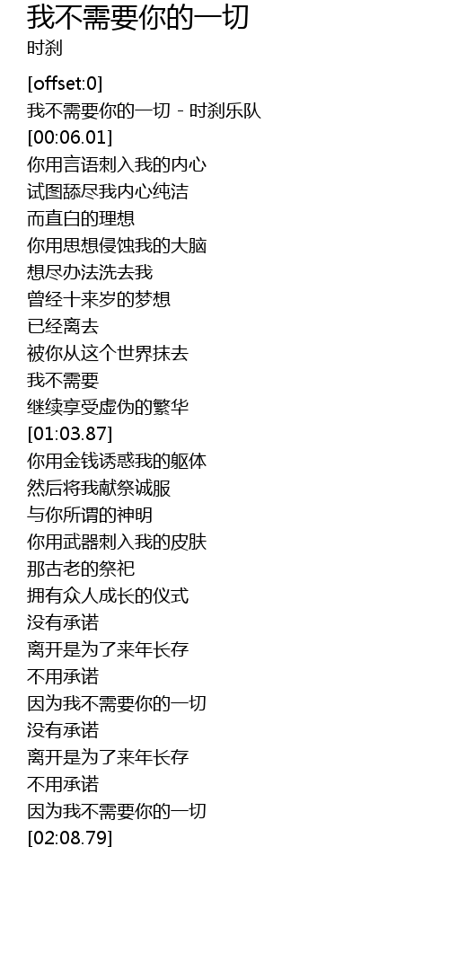 | [00:01.62] | 我不需要你的一切 - 时刹乐队 |