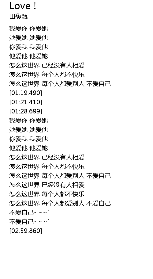 | [01:09.399] | zěn me zhè shì jiè měi ge rén dōu ài bié rén bù ài zì jǐ |