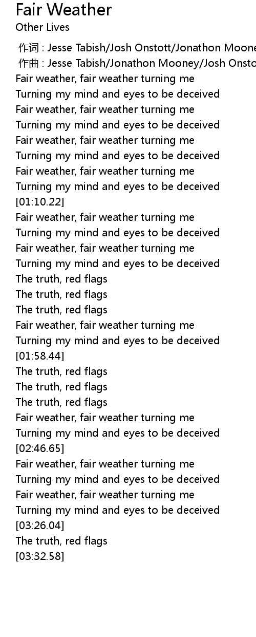 | [00:01.000] | 作曲 : Jesse Tabish/Jonathon Mooney/Josh Onstott |