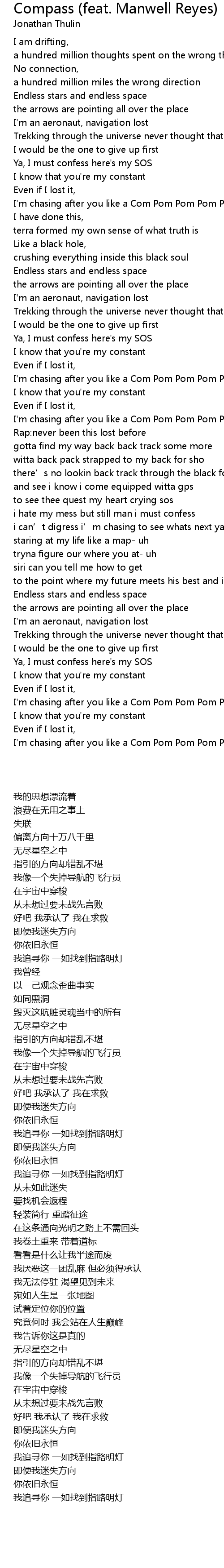 | [00:57.80] | I'm chasing after you like a Com Pom Pom Pom Pass (compass) |