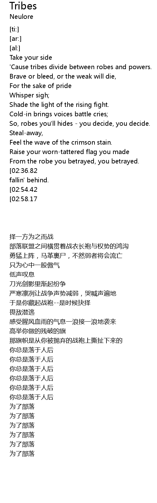 [00:09.10] 'Cause tribes divide between robes and powers.