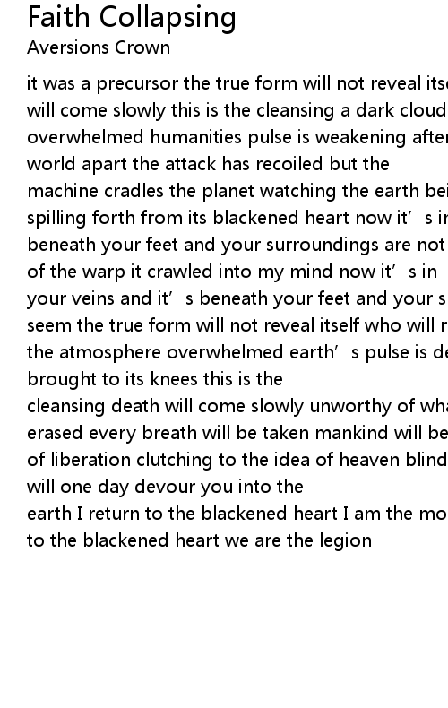 | your veins and it' s beneath your feet and your surroundings are not what they seem the true form will not reveal itself who will reveal it a dark cloud fills the atmosphere overwhelmed earth' s pulse is depleted watching the earth being brought to its knees this is the | |